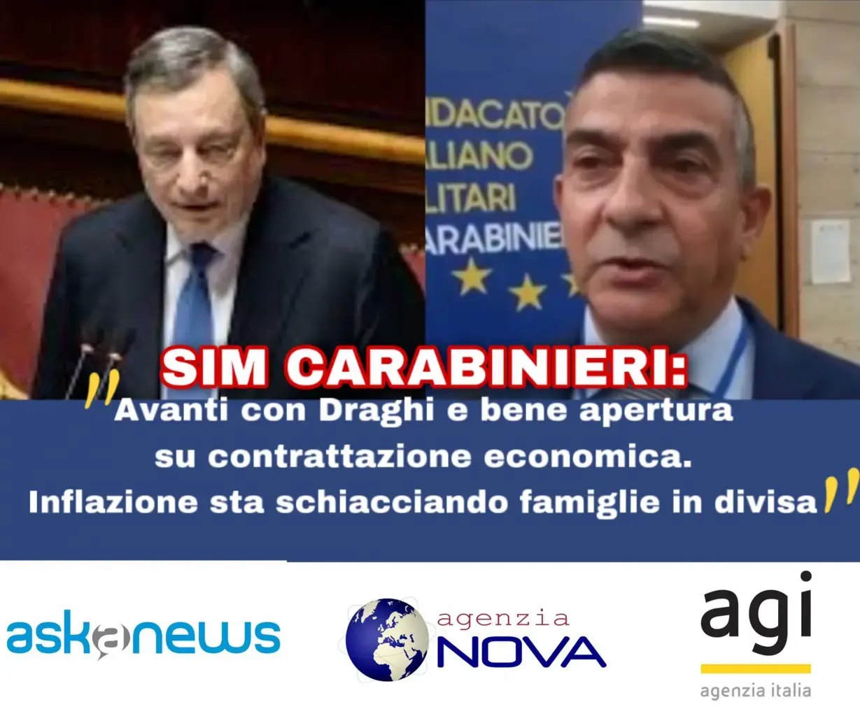 Governo: Sim carabinieri, avanti con Draghi e bene apertura a contrattazione economica, Roma, 20 lug - (Nova) - Avanti con il premier Draghi. "Non possiamo non riconoscere al premier Draghi la capacita' di gestire, ottimamente, uno dei momenti piu' bui del nostro Paese. Gli italiani chiedono all'unanimita' la sua guida e noi del Sim carabinieri siamo nella compagine sociale che supporta il Presidente del Consiglio". Cosi' in una nota Antonio Serpi, segretario generale del Sim carabinieri. "Personalmente, apprezzo molto le parole relative alla contrattazione economica che interessa le donne e gli uomini delle forze di polizia. Un pensiero importante espresso in Senato e che, ora, deve trasformarsi in concretezza poiche' l'inflazione sta schiacciando il ceto medio e proprio le 'famiglie di divisa' stanno affrontando la crisi con dignita' pur privandosi delle meritate vacanze utili al recupero psicofisico", continua Serpi. "Il Sim carabinieri oggi rappresenta migliaia di tesserati piu' le relative famiglie, avvertiamo il dovere di manifestare la vicinanza al Presidente del Consiglio ma sentiamo forte anche la responsabilita' di esporre le istanze dei nostri iscritti che, in questa crisi sociale, sono sempre piu' soli ed esposti al rischio di tensioni", conclude Serpi. (Com)NNNN