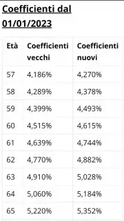 A decorrere dal 1° gennaio 2023, i coefficienti di trasformazione di cui alla Tabella A dell’Allegato 2 della legge 24 dicembre 2007, n. 247 e alla Tabella A della legge 8 agosto 1995, n. 335 (valori che concorrono al calcolo della pensione nella quota contributiva), sono rideterminati nella misura indicata nel decreto direttoriale emanato dal Ministero del lavoro, datato 01 dicembre 2022, di concerto con il Ministero delle Economie e delle Finanze.