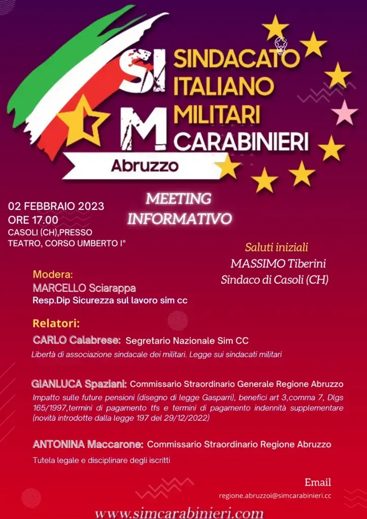 Giovedì 2 febbraio p.v. alle ore 17.00, si terrà presso la sala convegni del Teatro Comunale di Casoli, sito in Casoli, Via Umberto I, un Meeting Informativo organizzato dal Sim Carabinieri Abruzzo, in collaborazione del Sim Carabinieri Dipartimento T.S.P.” durante il quale verranno affrontate le seguenti tematiche: