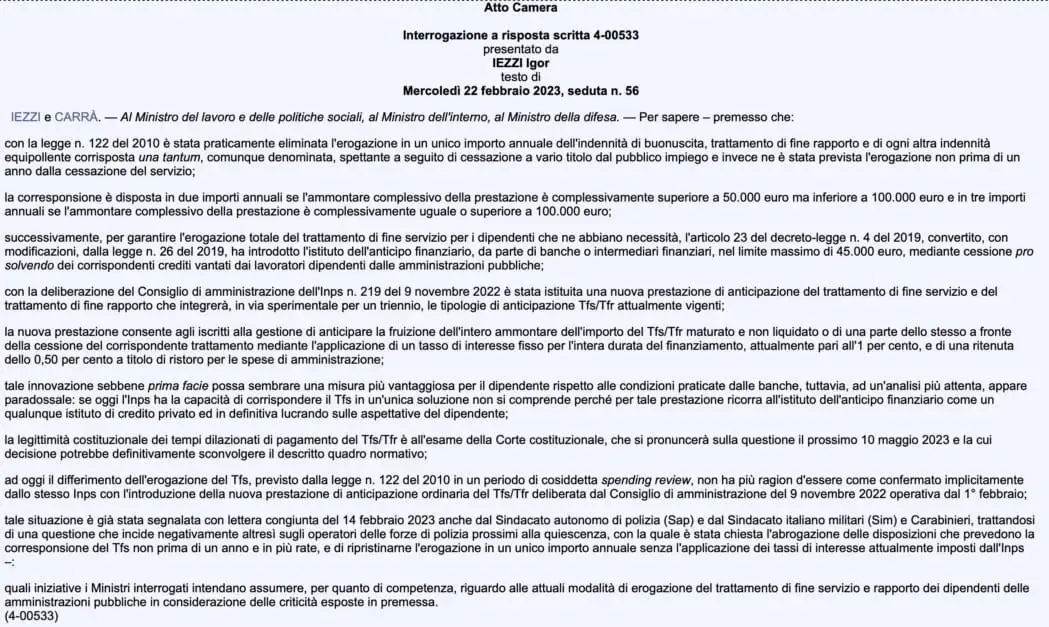 Nello scritto si interrogano i Ministri citati “su quali iniziative gli stessi intendano assumere, per quanto di competenza, riguardo alle attuali modalità di erogazione del trattamento di fine servizio e rapporto dei dipendenti delle amministrazioni pubbliche, in considerazione delle criticità esposte”.