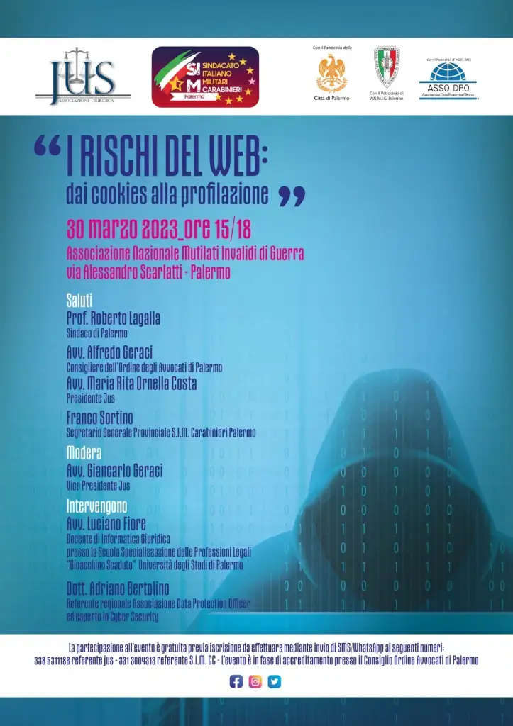 PALERMO - Il 30 marzo 2023, dalle ore 15:00 alle ore 18:00 si terrà, in via Alessandro Scarlatti presso la sede dell’Associazione Nazionale Mutilati Invalidi di Guerra, l’evento formativo “I rischi del web: dai cookies alla profilazione”, organizzato in sinergia dal S.I.M. Carabinieri Palermo e dalla Jus Associazione Giuridica.