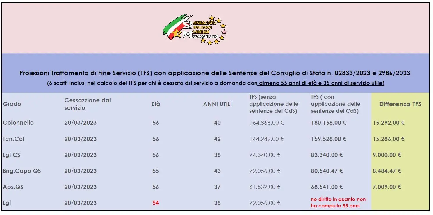 Alla luce di quanto esposto e soprattutto in relazione alle recenti Sentenze del Consiglio di Stato, il SIM Carabinieri presenterà una richiesta formale alla Direzione Generale dell’INPS al fine di disporre la corresponsione d’ufficio dei sei scatti stipendiali sul TFS al personale congedato a domanda con almeno 55 anni di età e 35 anni di servizio utile, ciò anche al fine di non gravare ulteriormente gli uffici giudiziari con inutili e ricorsivi procedimenti giudiziari. Pertanto, al personale già posto in congedo, si sconsiglia di aderire a costosi ed imprevedibili ricorsi collettivi o individuali e di presentare una semplice istanza di interruzione dei termini prescrizionali nell’attesa di ulteriori sviluppi in merito alla questione. Infine, allo scopo di smentire le informazioni errate contenute in alcune delle tabelle divulgate nei social si allega uno specchio riepilogativo distinto per gradi dove si evince la differenza tra il TFS calcolato sia “senza” che “con” l’attribuzione dei sei scatti.
