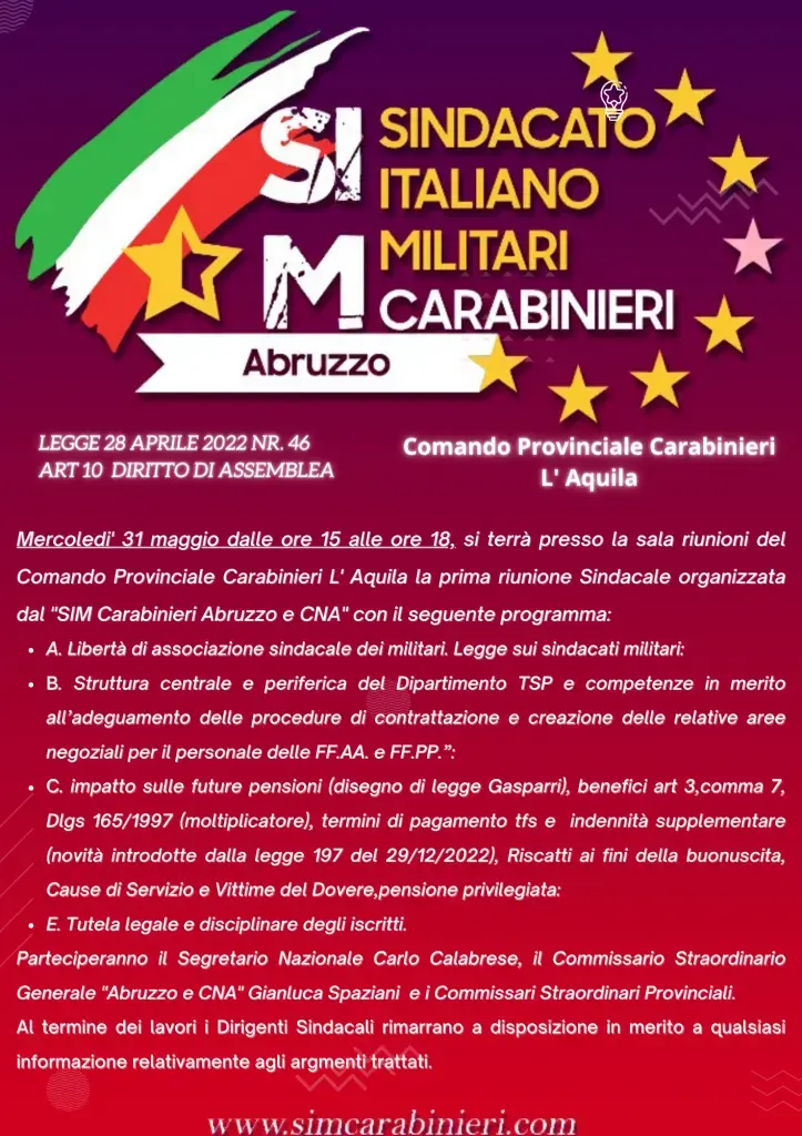 Mercoledi 31 maggio 2023 dalle ore 15 alle ore 18.00, il SIM Abruzzo terrà ufficialmente presso la sala briefing del Comando Provinciale Carabinieri Aquila la prima assemblea Sindacale, una svolta epocale nella conquista dei diritti e delle libertà sindacali.