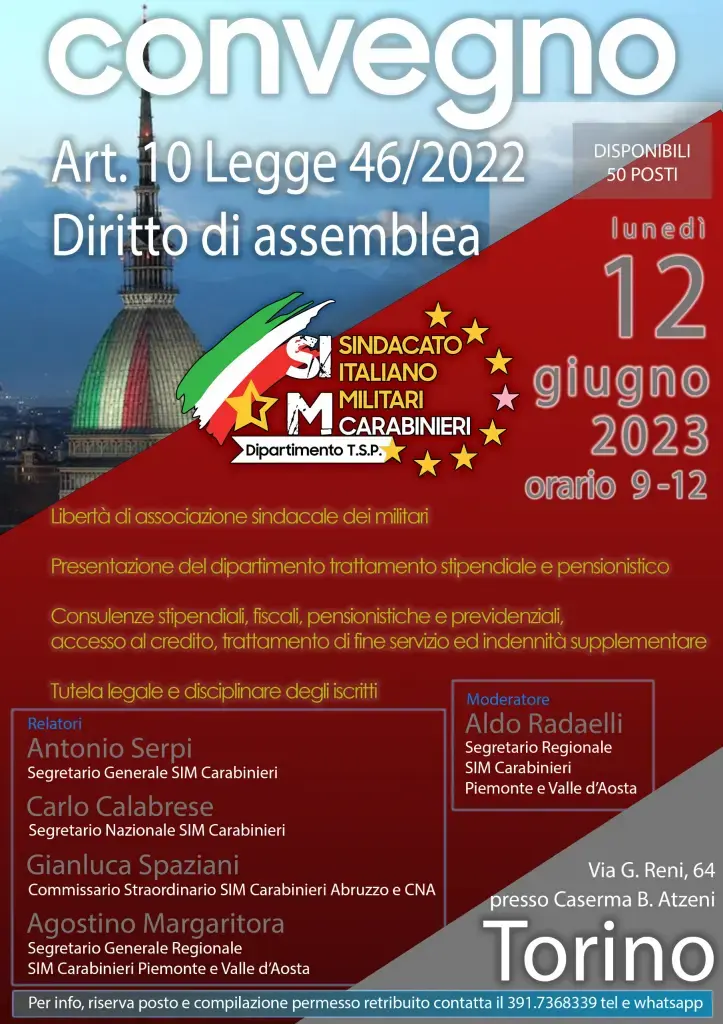 TORINO – Lunedì 12 giugno presso la caserma Benito Atzei di via Guido Reni 64, dalle 09.00 alle 12.00, si svolgerà la prima Assemblea Sindacale tra militari organizzata dal S.I.M. (Sindacato Italiano Militare) Carabinieri, unico sindacato organizzato e strutturato in Piemonte in grado di raggiungere i propri iscritti, come già fatto ad Alessandria e Susa, nonché primo Sindacato militare nella storia ad essere stato autorizzato ad operare dall’allora Ministro della Difesa Elisabetta Trenta il 10 gennaio 2019. I Carabinieri che vorranno prendere parte alla riunione potranno farlo con permesso retribuito ai sensi dell’art. 10 della legge 46/2022 che permette, nel limite di 10 ore annue, sia essi iscritti sia essi non iscritti ad alcun sindacato, di partecipare alle assemblee tra militari.