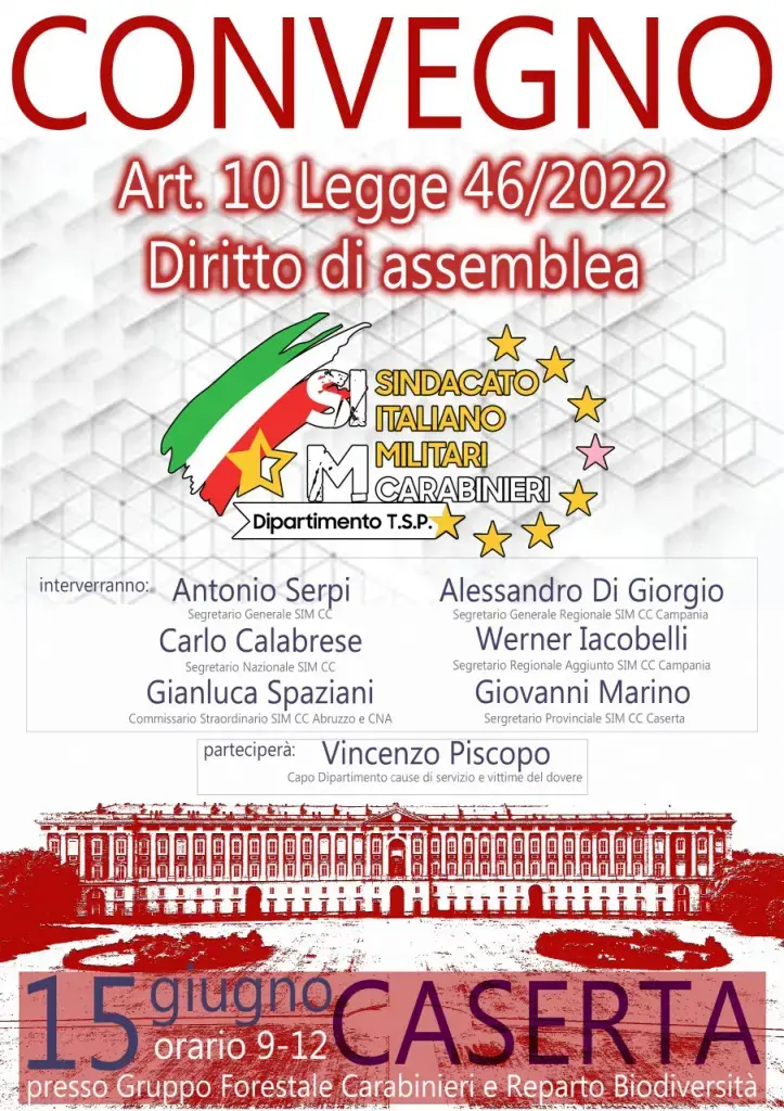 Giovedi 15 giugno 2023 dalle ore 09.00 alle ore 12.00, il SIM Campania terrà ufficialmente, presso la sala briefing del Reparto Carabinieri per la Biodiversità e del Gruppo Carabinieri Forestali di Caserta, la prima assemblea Sindacale: una svolta epocale nella conquista dei diritti e delle libertà sindacali.
