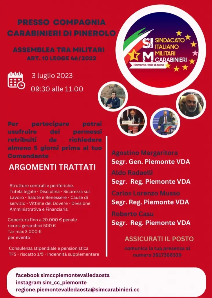 PINEROLO - Si è tenuta ieri 3 luglio, con molta soddisfazione dei partecipanti, l’assemblea tra militari presso il Comando Compagnia Carabinieri di Pinerolo, organizzata dal SIM Piemonte e Valle D’Aosta. Vi hanno partecipato in qualità di relatori il segretario generale Agostino Margaritora, i segretari regionali Aldo Radaelli, Carlos Musso, Roberto Casu ed il commissario straordinario provinciale Matteo Caprara. Sono state illustrate la struttura centrale e periferica del SIM, le piattaforme ed i servizi dedicati ai tesserati e la facilità di interazione con l’uso dell’app per Android e IOS.