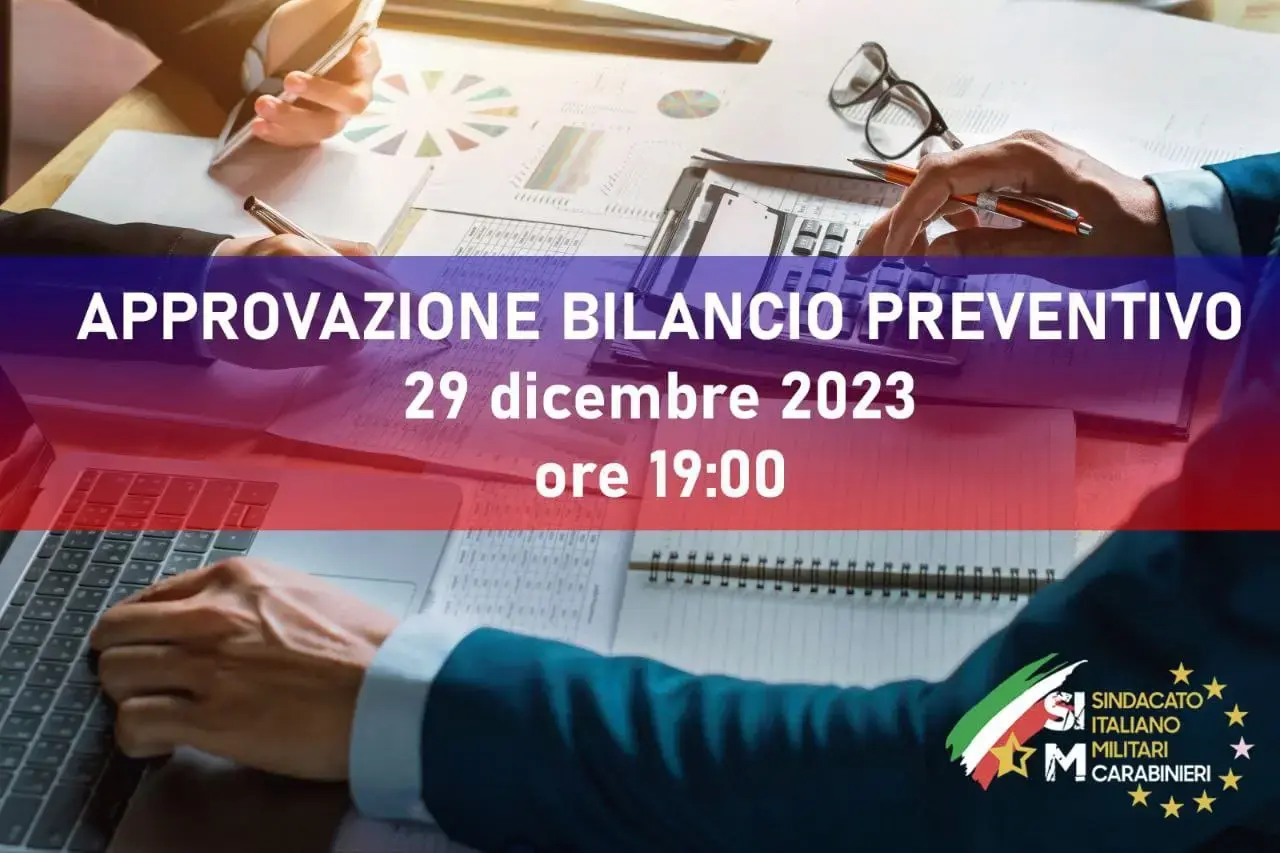 Ai sensi della legge 22 aprile 2022 n. 46 art. 7, presso la SEDE Nazionale SIM Carabinieri, via Annia 48, alle ore 19 del 29 dicembre 2023, verrà sottoposto per l’approvazione il Bilancio preventivo 2024. Lo stesso verrà reso conoscibile al pubblico, non oltre dieci giorni dalla sua approvazione, mediante idonee forme di pubblicità.