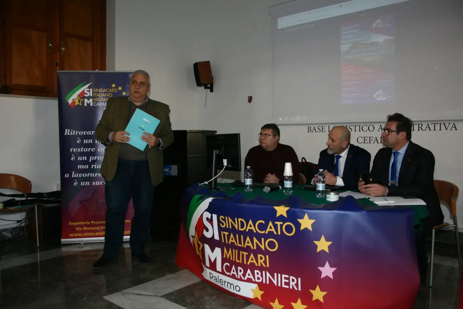 Dopo i saluti di apertura del Segretario Provinciale Generale del SIM Carabinieri di Palermo Franco SORTINO, sono intervenuti: Riccardo MONTI in qualità di Segretario Generale Nazionale Aggiunto, Vito SAULLE Segretario Generale Regionale S.I.M. Carabinieri Sicilia, Maurizio MASTROSIMONE Consulente S.I.M. Carabinieri, Giuseppe CIAPPA Segretario Generale Provinciale Aggiunto, il Segretario Provinciale Salvatore SCIORTINO e la presenza dei Consiglieri Provinciali Felice BALLETTA e Gianluca GUERRA, il segretario di Sezione di Palermo Piazza Verdi Giacomo FASOLA, i segretari della Segreteria unificata di Cefalù e Termini Imerese Pasquale LO SAPIO E Francesco MAZZOLA, il segretario della Sezione di Petralia Sottana Luca MAZZOLA, nonché il Segretario Provinciale del sindacato di Polizia CO.I.S.P di Palermo Sergio SALVIA, e due esponenti del sindacato di Polizia SIULP, il Consigliere Provinciale e Segretario di Sezione di Termini Imerese Salvatore DI CARLO, e il Vice Segretario di Sezione Lino PIRRONE.