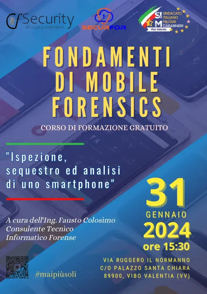 Vibo Valentia – Si è svolto il 31 gennaio scorso, nello storico Palazzo Santa Chiara, un corso di formazione professionale di “Fondamenti di Mobile Forensics – Ispezione, Sequestro e Analisi di uno Smartphone” organizzato dalla Segretaria Provinciale del SIM Carabinieri Vibo Valentia, rappresentata nell’occasione dal Segretario generale provinciale aggiunto Marco Drago.