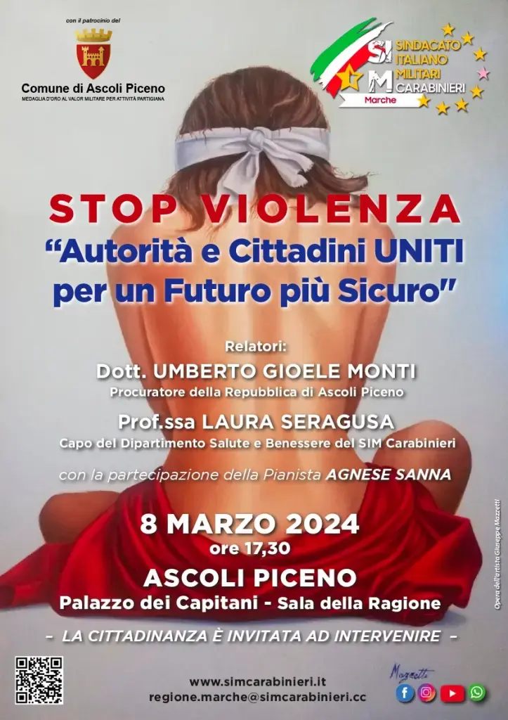 La Segreteria Provinciale di Ascoli Piceno del SIM Carabinieri Marche è onorata di annunciare il convegno "Stop Violenza: Autorità e Cittadini Uniti per un Futuro Più Sicuro", che si terrà l'8 marzo ad Ascoli Piceno, presso il prestigioso Palazzo dei Capitani, nella Sala della Ragione, alle ore 17.30.