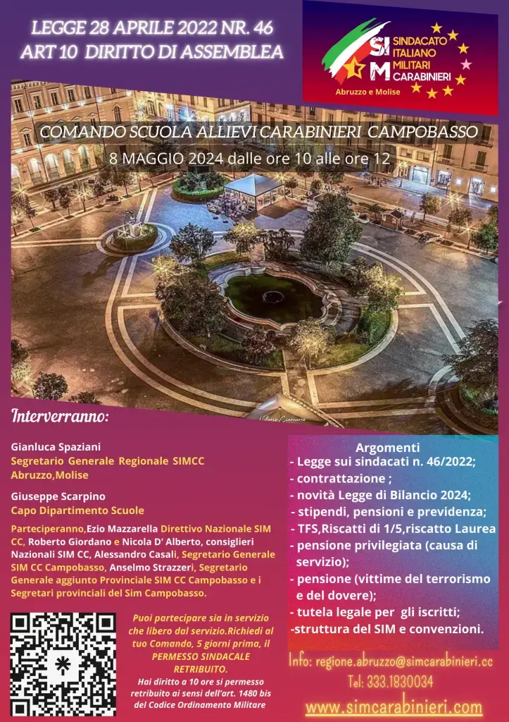 Mercoledi 08 maggio 2024 dalle ore 10 alle ore 12.00, il SIM Abruzzo e Molise, in collaborazione con il Dipartimento Scuole e Dipartimento TSP terrà ufficialmente presso la sala riunioni della Scuola allievi Carabinieri di Campobasso un’assemblea Sindacale, rivolta al quadro permanente.