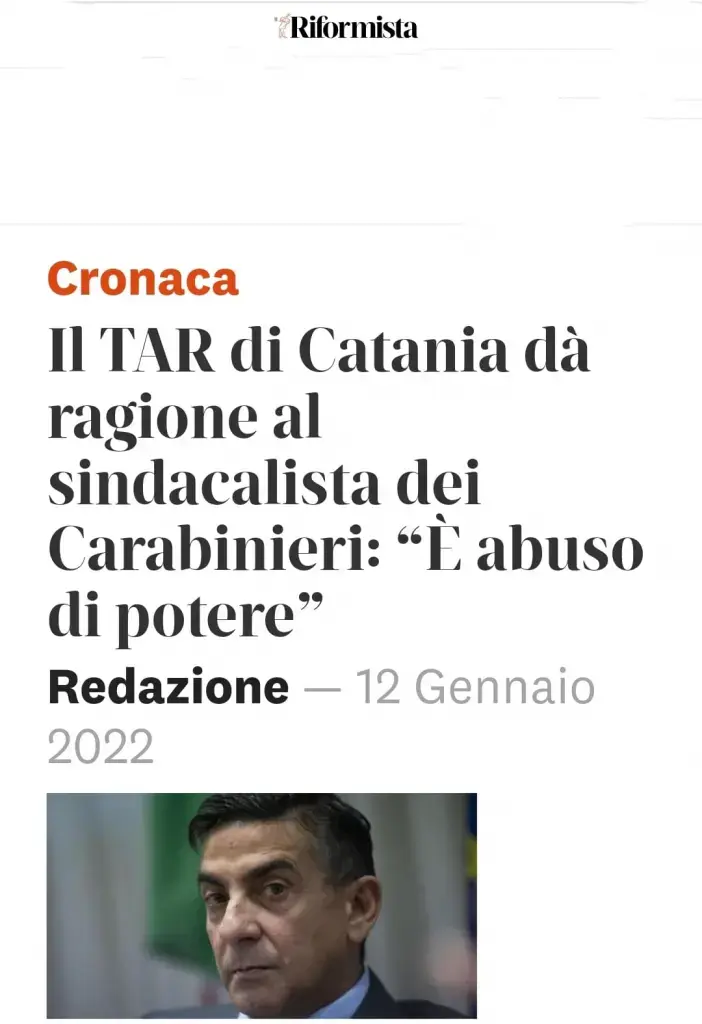 Il TAR di Catania dà ragione al sindacalista dei Carabinieri: “È abuso di potere”