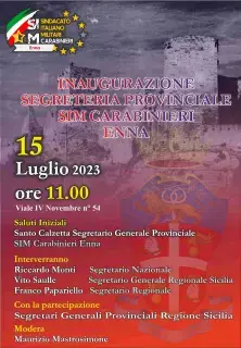 ENNA - In una splendida giornata d’estate, è stata inaugurata la segreteria provinciale del SIM Carabinieri lo scorso 15 luglio, in viale IV novembre 54, nella sede concessa dal Comune di Enna.Dopo aver reso omaggio ai caduti delle Forze ...