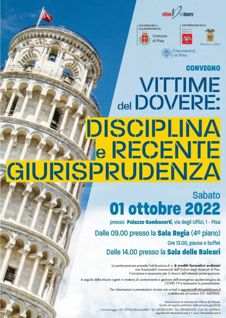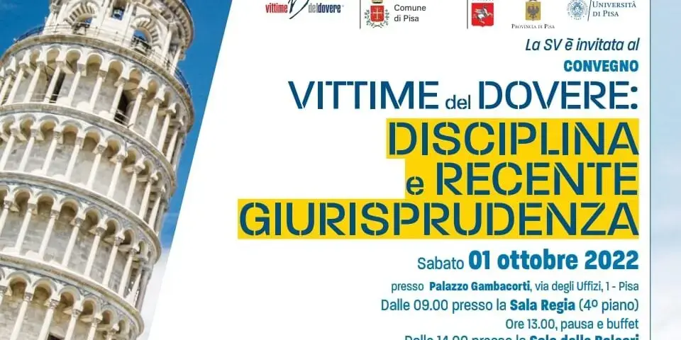 Si rinnova l’importante e atteso appuntamento a Pisa con l’Associazione Vittime del Dovere. Sabato 1° ottobre, dalle 9.30 alle ore 16.30, presso il Comune di Pisa, Palazzo Gambacorti, via degli Uffizi n.1, si terrà il Convegno dal titolo “VITTIME DEL DOVERE: DISCIPLINA E RECENTEGIURISPRUDENZA”. L’evento, che giunge alla sua seconda edizione, si inserisce tra i progetti e gli impegni in ambito culturale e di approfondimento giuridico professionale realizzati annualmente dall’Associazione.