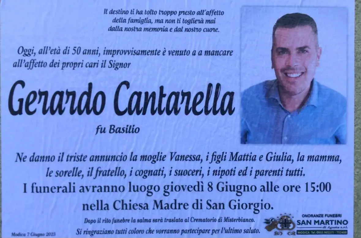 I funerali saranno celebrati giovedì 8 giugno, alle ore 15.00, presso la Chiesa Madre di San Giorgio di Modica (RG).