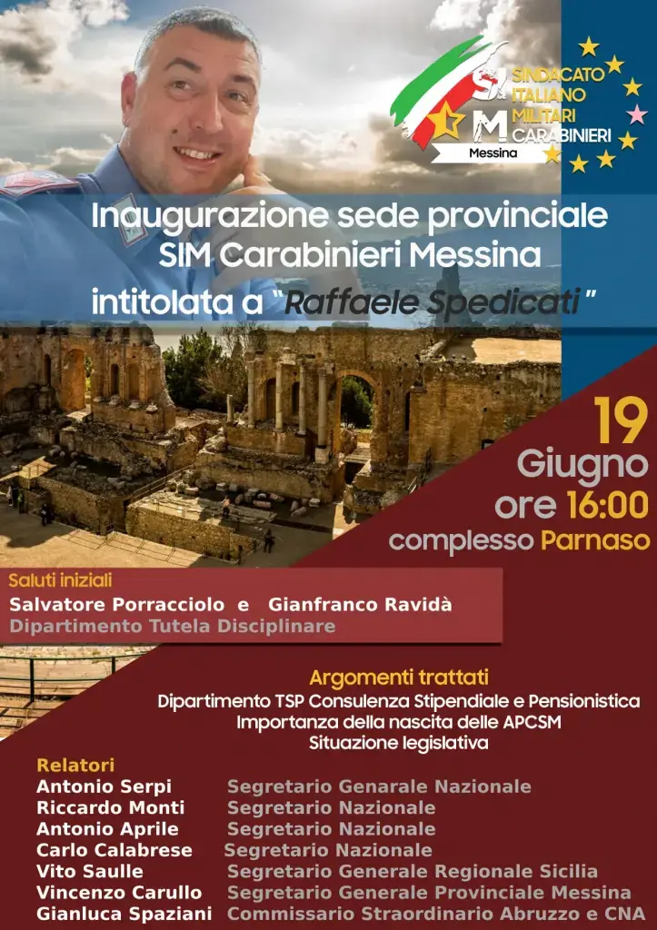 MESSINA - Si terrà lunedì 19 giugno alle ore 16.00 l'inaugurazione della Sede provinciale del SIM CARABINIERI di Messina , che vedrà la partecipazione del Segretario Generale Nazionale, Antonio Serpi, accompagnato dai segretari nazionali Riccardo Monti, Antonio Aprile e Carlo Calabrese.