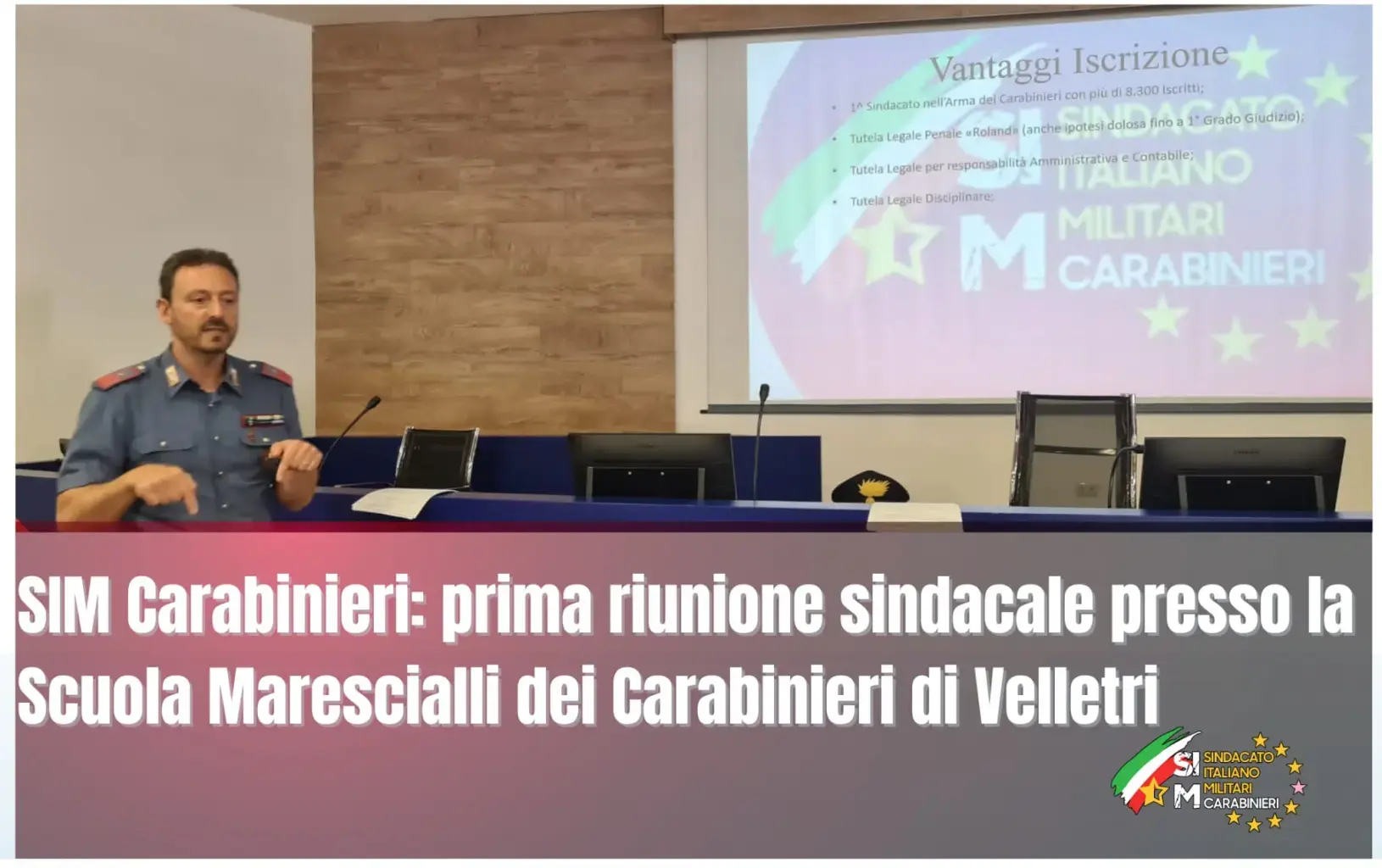 Velletri (RM) - Si è tenuta ieri, mercoledì 21 giugno, la prima riunione sindacale presso la Scuola Marescialli dei Carabinieri di Velletri, durante la quale Mario Fusco, Commissario Straordinario SIM per il comparto Scuole di Velletri, ha illustrato le motivazioni per cui iscriversi ad un Sindacato e, in particolare, perché aderire al SIM CARABINERI, primo Sindacato regolarmente assentito nella Storia delle Forze Armate e primo per numero di adesioni.