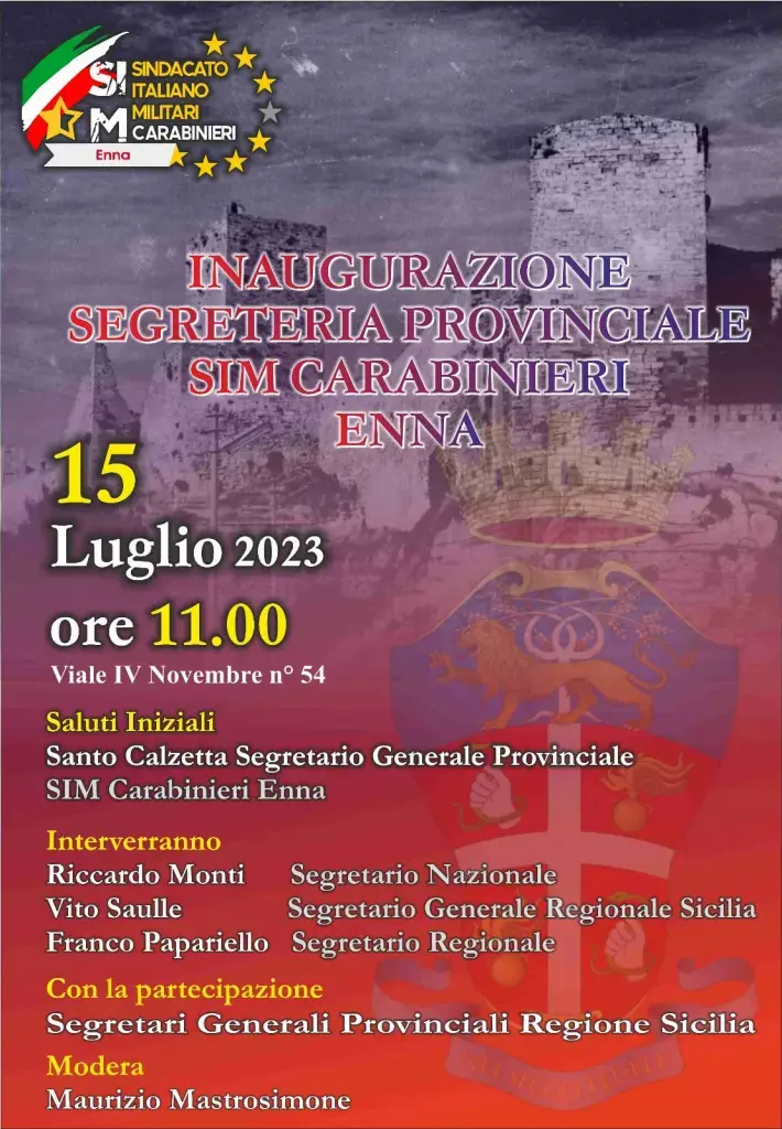 ENNA - Sarà la prima sede di un sindacato delle Forze Armate Italiane nella provincia di Enna quella che sarà inaugurata dal SIM Carabinieri il prossimo 15 luglio alle ore 11, in viale IV novembre 54, nella sede concessa dal Comune di Enna.