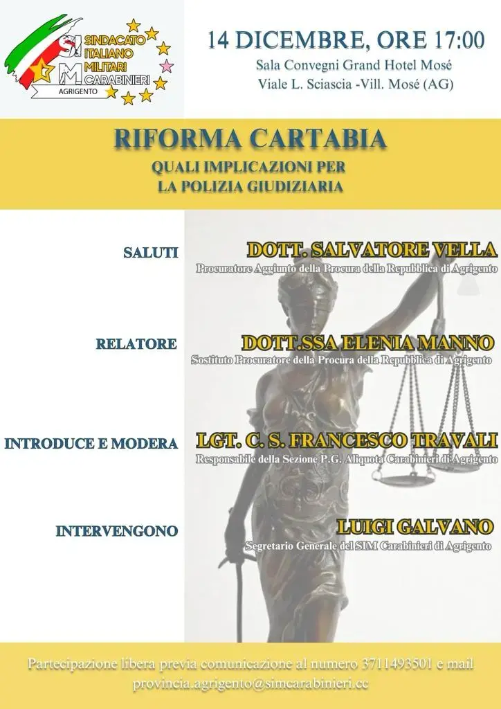 AGRIGENTO - Giovedì 14 dicembre, presso la sala congressi del Grand Hotel Mosè, si è tenuto un convegno promosso dal SIM Carabinieri di Agrigento sul tema “RIFORMA CARTABIA”, quali implicazioni per la Polizia Giudiziaria."