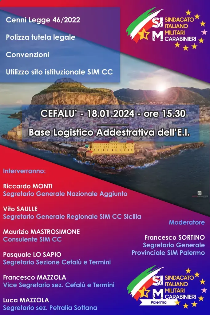 Giovedì 18 Gennaio, presso la Base Logistico Addestrativa dell’Esercito Italiano, si è tenuto un convegno promosso dal S.I.M. Carabinieri di Palermo trattando vari temi fra cui la Legge 46/2022, la Polizza Tutela Legale, Convenzioni e non per ultimo illustrato il sito internet www.simcarabinieri.com.