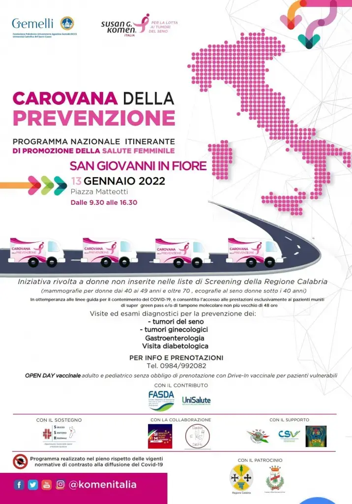Un’attività che assume maggiore rilevanza in un momento particolarmente delicato come quello dell’emergenza sanitaria che ha visto cancellare migliaia di prestazioni sanitarie, ostacolando il percorso di prevenzione. Il tour calabrese ha il patrocinio della Regione Calabria, dei comuni di Praia a Mare, Roggiano Gravina, San Giovanni in Fiore e il sostegno del Servizio Sanitario Provinciale.